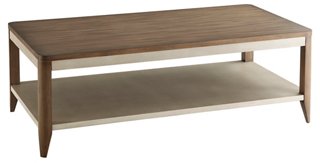 This coffee table leans into its coastal farmhouse look with natural wood finishes and a mixed material design.